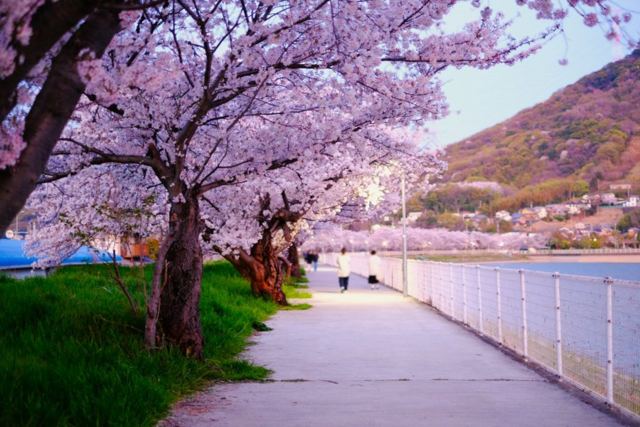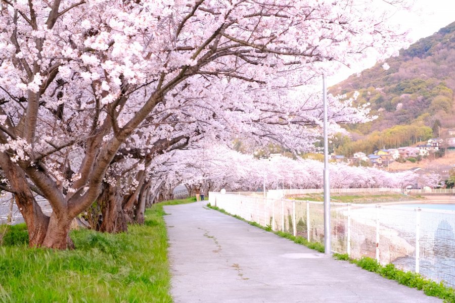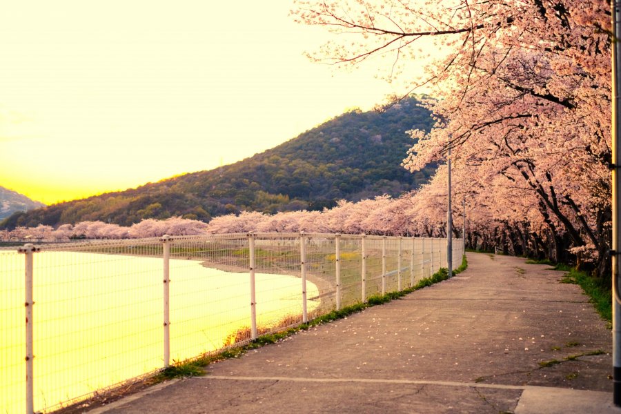 Kamata Pond, located in Sakaide City, Kagawa Prefecture, is a scenic spot renowned for its stunning cherry blossom trees lining the water's edge. Come spring, approximately 100 Somei Yoshino cherry trees bloom magnificently along the pond's shore for about 700 meters. Visitors are enchanted by the “cherry blossom tunnel” overhead, the inverted cherry blossoms reflected on the calm water surface, and the views of the Sanuki Plain. The pond's perimeter is about 1.6 km, making it a popular course for club running activities and morning/evening walks.