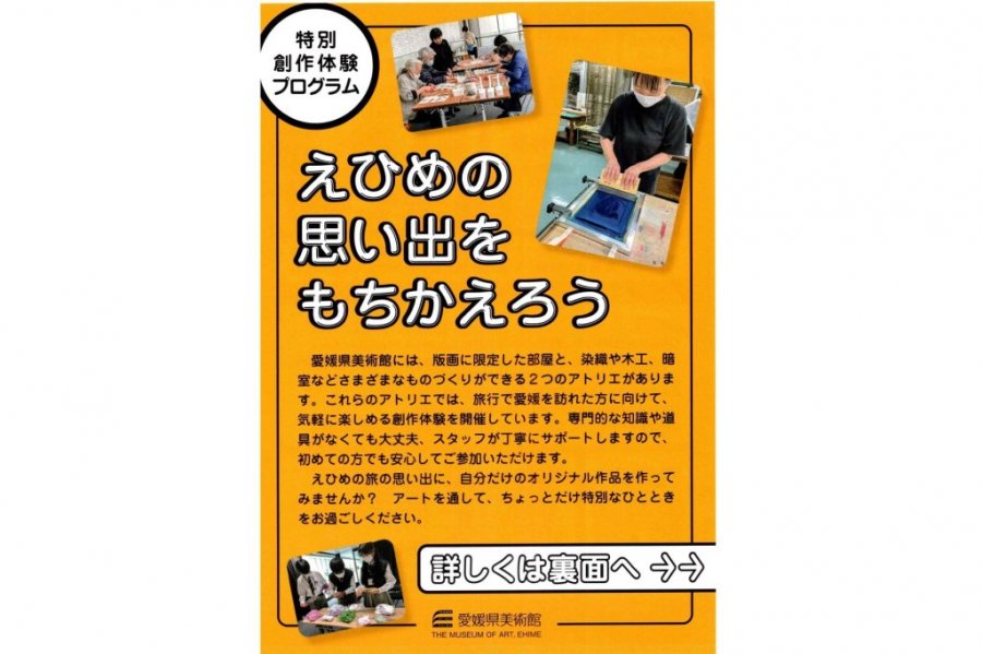 愛媛県美術館には、版画に限定した部屋と、染色や木工、暗室などさまざまなものづくりができる2つのアトリエがあります。これらのアトリエでは、旅行で愛媛を訪れた方に向けて、気軽に楽しめる創作体験を開催しています。