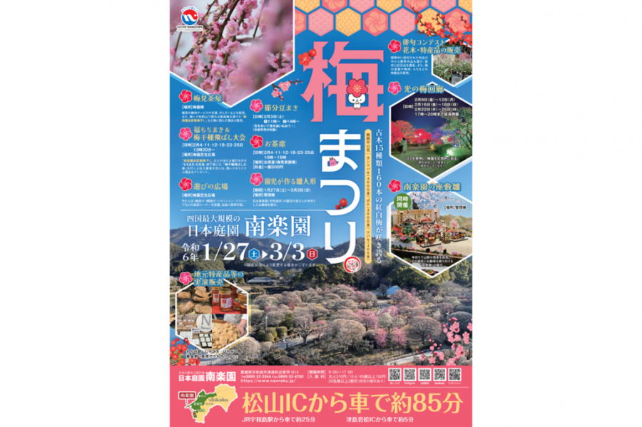 | イベント内容 | ○南楽園の座敷雛 2026年1月31~3月8日 ○光の梅回廊 LEDを使い梅園を幻想的にライトアップ 2026年2月10日~15日/2月20日~23日 17:00~20:00 ○梅もちまき&梅干種飛ばし大会 「南楽園自家製梅干し」等が当たる福引付き「もちまき」、終了後には「梅干種飛ばし大会」を行い上位3名にオリジナル商品プレゼント。 2026年2月8日、11日、15日、22日、23日、3月1日 13:30~ ○お茶席 料金:一服500円(和菓子付) 2026年2月8日、11日、15日、22日、23日、3月1日 10:00~15:00 |