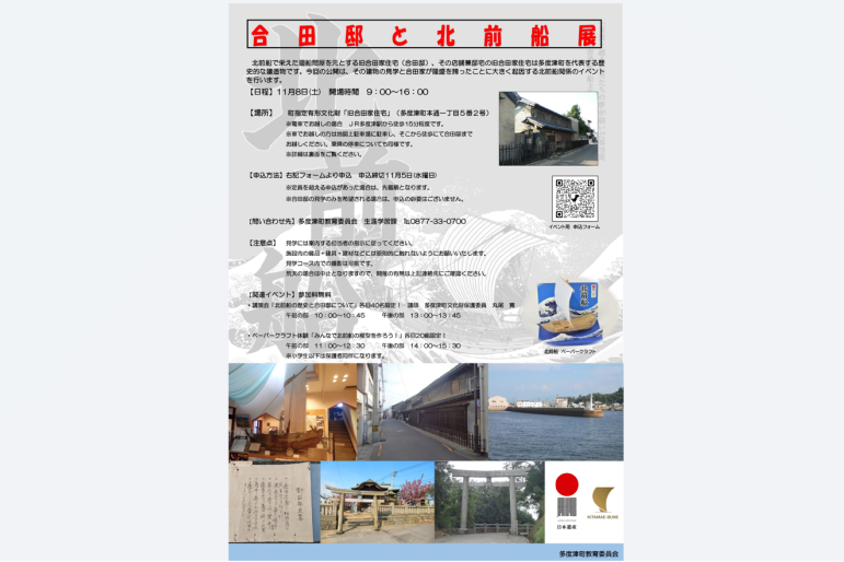 | イベント内容 | ・町指定有形文化財「旧合田家住宅」(合田邸)公開および施設内での展示 ・講演会「北前船の歴史と合田邸について」講師 多度津町文化財保護委員 丸尾 寛 午前の部 10:00~10:45 午後の部 13:00~13:45 ・北前船ペーパークラフトのワークショップ 「みんなで北前船の模型を作ろう!」 午前の部 11:00~12:30 午後の部 14:00~15:30 |