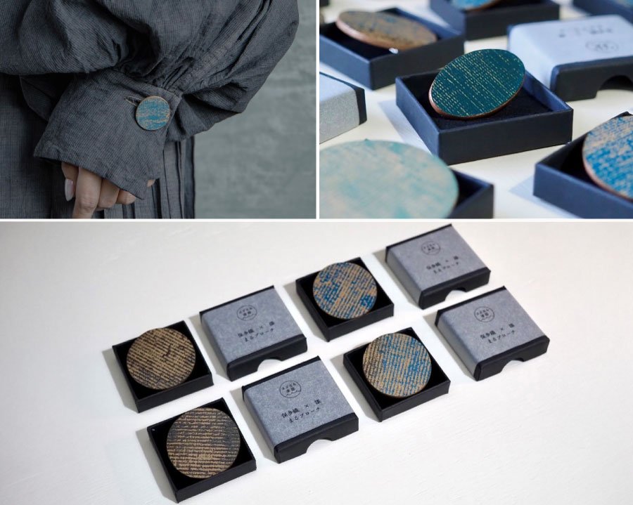 碁盤の目のような独特の織りが生み出す風合いが魅力の「保多織」。そして、蒟醤(きんま)や存清(ぞんせい)、彫漆(ちょうしつ)といった多様な技法を用い、鮮やかな色彩と緻密な模様を描き出す「香川漆器」。 今回のパリでの出品に向けて、二人の手によりこれら二つの手仕事が融合しました。漆の技法である「布目塗り」を応用し、保多織ならではの美しい凹凸をそのまま活かしたボタンが制作されています。