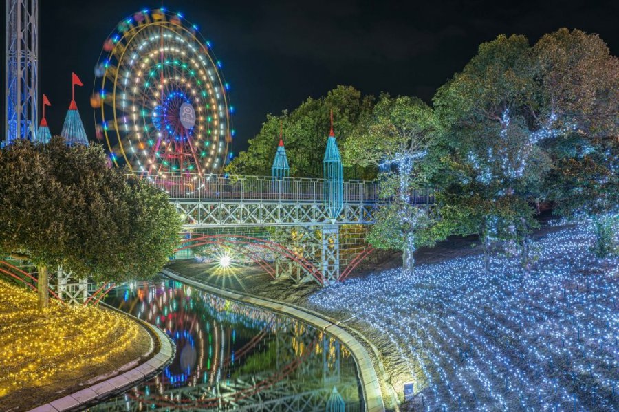 夜には、2022年度全国イルミネーションアワード第3位を受賞し、日本夜景遺産に認定された「レオマ光ワールド」で、3Dプロジェクションマッピングや中四国最大約250万球のイルミネーションで光の世界が広がります。