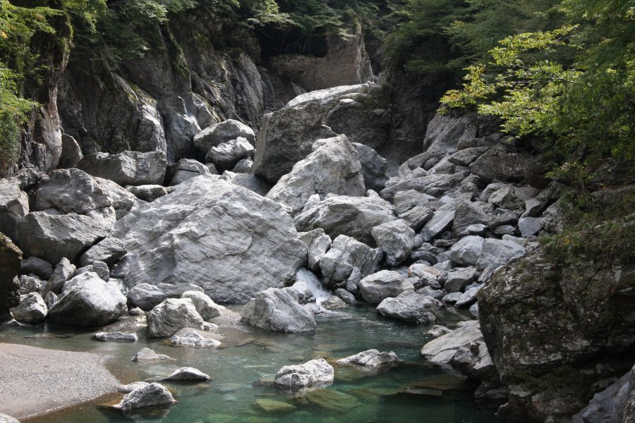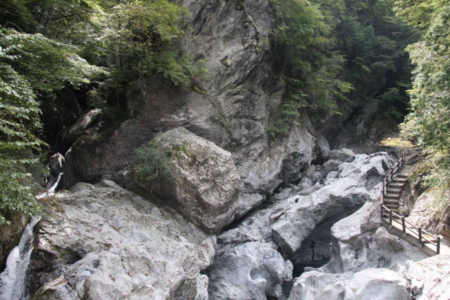 国道440号から山道を下った場所に位置する甌穴群。大小合わせて30個ほど甌穴があるが、その中でも大きいトンネル釜、獅子釜、メガネ釜など8個の甌穴を選び、その形が釜に似ていることから八釜の甌穴群と名付けられた。川幅25m、長さ65mの間に川床の硬質のフリント質角岩が渦龍によって形成された物で最も大きい物は直径9~12mもあり、国の特別天然記念物に指定されている。甌穴郡の周りは遊歩道が整備されているため、存分に景観を楽しむことができる。