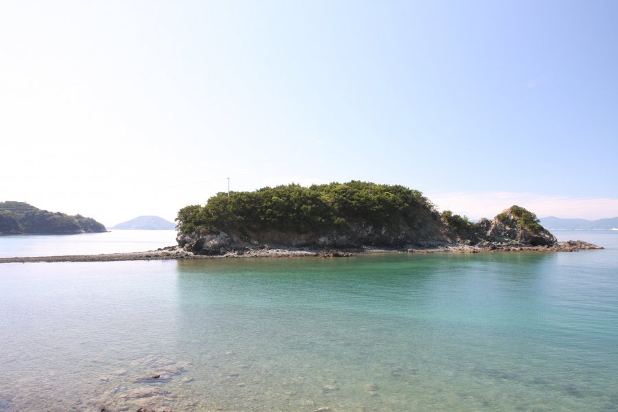 八幡浜市街地から海岸線を三瓶方面へ南下した、大釜地区の約100mほど沖合いにある小さな島。ねずみが海上に座っているような形をしているところから「ねずみ島」と呼ばれ、地元の人たちに親しまれている。普段は国道から眺めるのみだが、干潮になるとねずみ島に向かって道が現れ、歩いて渡ることができる。