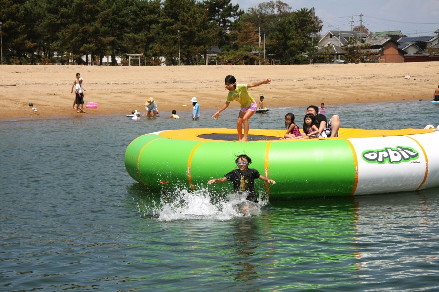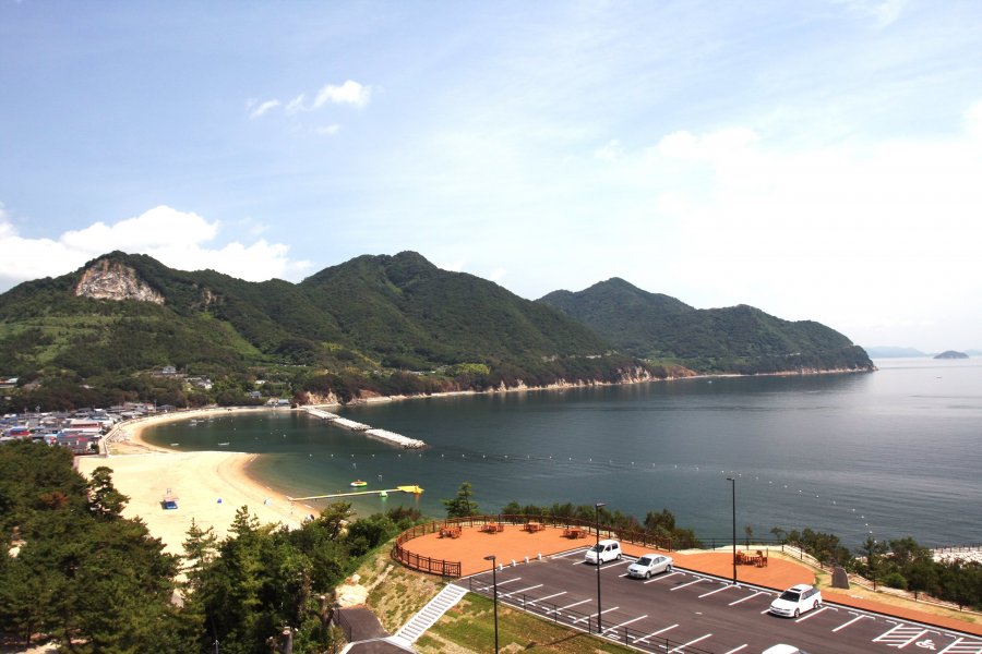 環境省選定の「快水浴場百選」に、愛媛県で唯一選ばれた美しい海水浴場。ひょうたん形をした弓削島のくびれた箇所に弧を描き、透き通った海水と穏やかな波で、シーズンになれば多くの人で賑わいを見せる。また、遊具も設置されており、家族やグループで訪れても楽しめる。自然豊かな緑を背に、広がる青々とした海を眺めていると、ここが日本ではない感覚を感じるほど穏やかな時間が過ごせる。