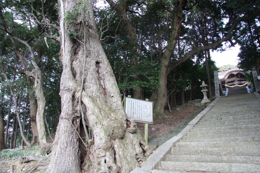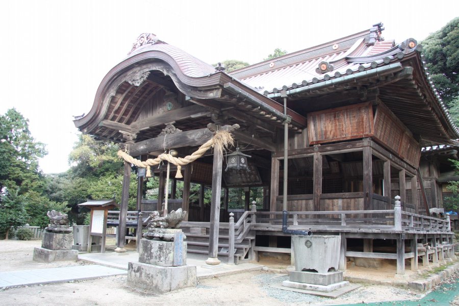 伊予灘を見守る小高い山に位置し、神聖な空気に包まれた神社。境内へ続く階段の両側には豊かな緑が広がり、振り返ると果てしなく続く伊予灘の美しい景色を見ることができる。境内に足を踏み入れると神々しい雰囲気が張り詰めており、狛犬ではなく全国的にも珍しい狛亀が、威厳溢れる堂々とした姿で出迎えてくれる。社殿は長年の潮風で独特の色合いとなっており、独自の雰囲気を醸し出している。