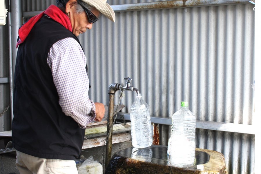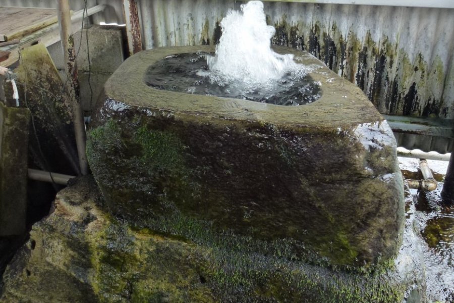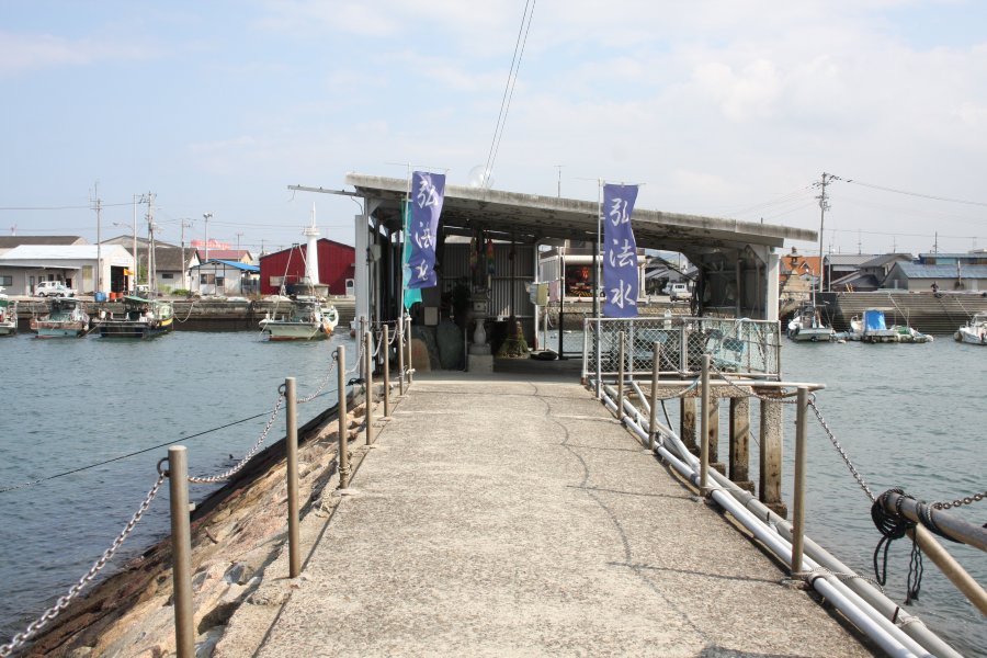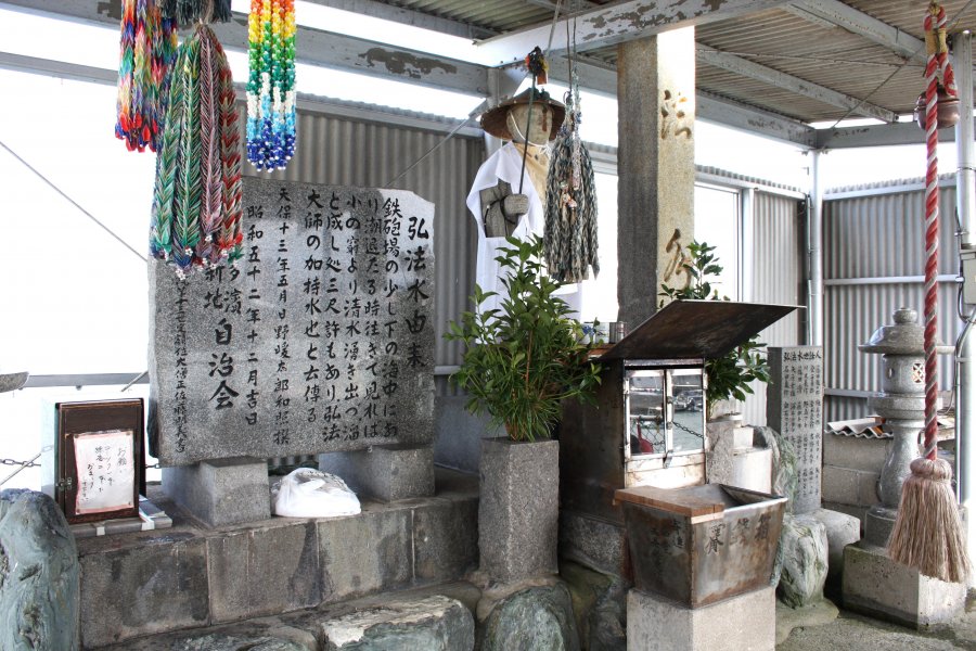 【西条市】弘法水 こうぼうすい 海底にある水源から湧き続ける地元住民のオアシス 海底にある水源から清水を汲み上げている弘法大師の伝説が残る湧水。弘法大師が四国霊場を巡礼している途中で休息していたところ、老婆が飲み水を水桶に入れて歩いており、弘法大師は一杯の水をもらい喉の渇きを潤した。後、この水は遥か遠くから汲み取ってきたということを知った弘法大師が、杖の先で大地を2、3回突くと清水が湧き出したという伝説が残っている。毎日多くの人が水を汲んだり、手を清める場として利用しており、弘法水の付近にある民家には長寿の人が多いと言われている。 エリア 西条市周辺 カテゴリ 山・谷・滝 フォトツアーを見る 住所 愛媛県西条市樋之口456-12 電話番号 0897-52-1690(西条市役所 観光振興課) 休業日 無休 料金 無料 駐車場 なし 西条市ホームページ「うちぬき散歩コース」
