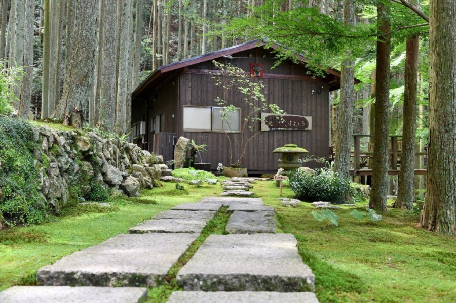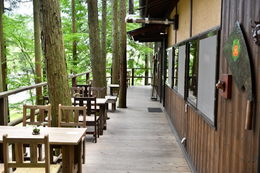 敷地内の喫茶では、50メートル地下からくみ上げた地下水を使用したコーヒー、抹茶などのドリンクや、地元の食材を使ったスイーツがあり、天気のいい日は外のウッドデッキで、自然を感じながら楽しむことができる。