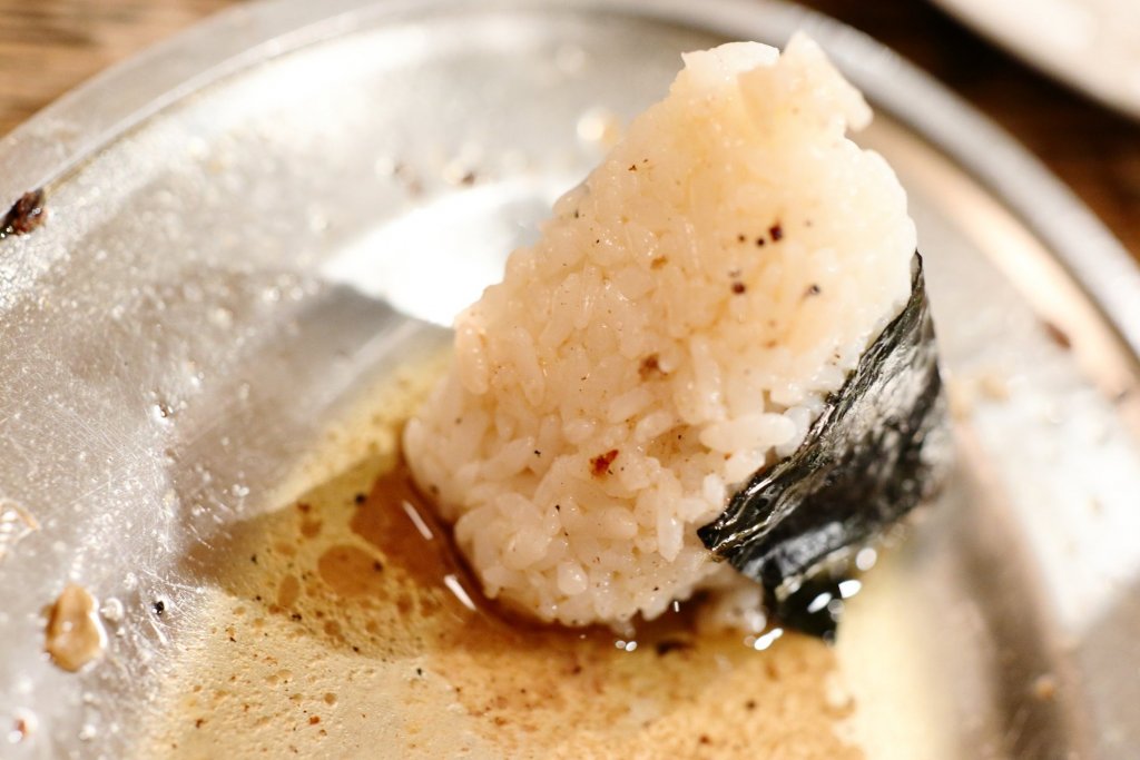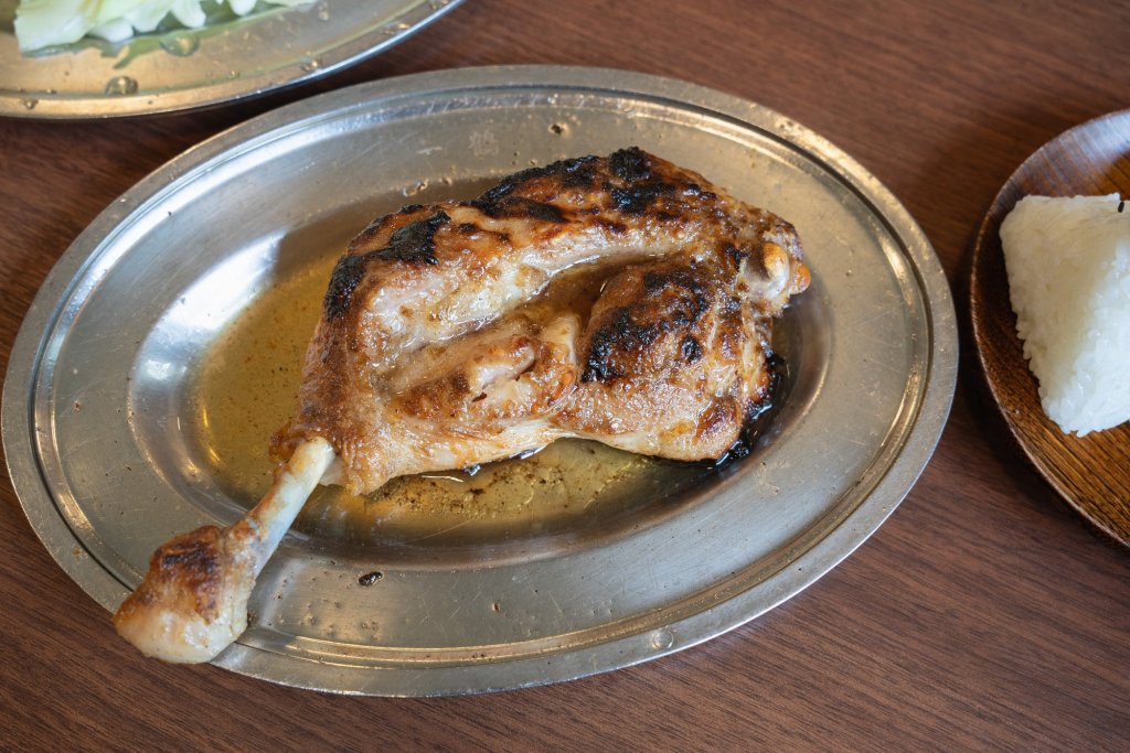 帶骨雞腿另一個重點就是從肉中溢出的「黃金雞油」!吃完帶骨雞腿後,盤子上會留下從雞肉流出的鮮美雞油,可以拿附上的高麗菜沾著吃,或是在最後點一個飯糰拌著雞油吃。這些可是饕客才會知道的吃法,高麗菜和白米吸滿雞肉的鮮味,讓人一口接一口,停不下來!